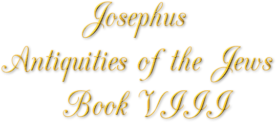 5. There was then a woman queen of Egypt and Ethiopia; she was inquisitive into philosophy, and one that on other accounts also was to be admired. When this queen heard of the virtue and prudence of Solomon, she had a great mind to see him; and the reports that went every day abroad induced her to come to him, she being desirous to be satisfied by her own experience, and not by a bare hearing; (for reports thus heard are likely enough to comply with a false opinion, while they wholly depend on the credit of the relators;) so she resolved to come to him, and that especially in order to have a trial of his wisdom, while she proposed questions of very great difficulty, and entreated that he would solve their hidden meaning. Accordingly she came to Jerusalem with great splendor and rich furniture; for she brought with her camels laden with gold, with several sorts of sweet spices, and with precious stones. Now, upon the king's kind reception of her, he both showed a great desire to please her, and easily comprehending in his mind the meaning of the curious questions she propounded to him, he resolved them sooner than any body could have expected. So she was amazed at the wisdom of Solomon, and discovered that it was more excellent upon trial than what she had heard by report beforehand; and especially she was surprised at the fineness and largeness of his royal palace, and not less so at the good order of the apartments, for she observed that the king had therein shown great wisdom; but she was beyond measure astonished at the house which was called the Forest of Lebanon,as also at the magnificence of his daily table, and the circumstances of its preparation and ministration, with the apparel of his servants that waited, and the skillful and decent management of their attendance: nor was she less affected with those daily sacrifices which were offered to God, and the careful management which the priests and Levites used about them. When she saw this done every day, she was in the greatest admiration imaginable, insomuch that she was not able to contain the surprise she was in, but openly confessed how wonderfully she was affected; for she proceeded to discourse with the king, and thereby owned that she was overcome with admiration at the things before related; and said, All things indeed, O king, that came to our knowledge by report, came with uncertainty as to our belief of them; but as to those good things that to thee appertain, both such as thou thyself possessest, I mean wisdom and prudence, and the happiness thou hast from thy kingdom, certainly the same that came to us was no falsity; it was not only a true report, but it related thy happiness after a much lower manner than I now see it to be before my eyes. For as for the report, it only attempted to persuade our hearing, but did not so make known the dignity of the things themselves as does the sight of them, and being present among them. I indeed, who did not believe what was reported, by reason of the multitude and grandeur of the things I inquired about, do see them to be much more numerous than they were reported to be. Accordingly I esteem the Hebrew people, as well as thy servants and friends, to be happy, who enjoy thy presence and hear thy wisdom every day continually. One would therefore bless God, who hath so loved this country, and those that inhabit therein, as to make thee king over them.